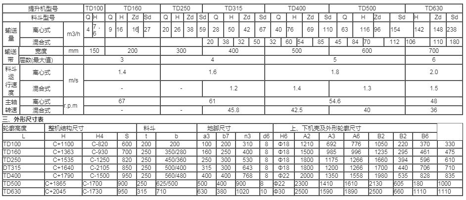 TD帶式斗式提 升機(jī),按國家標(biāo)準(zhǔn)設(shè)計(jì)制造。選用高強(qiáng)力運(yùn)輸帶,有離心式/混合式兩種方式卸料,提升高度達(dá)40米(物料r≤1.5),輸送量4-240m3/h)。 本機(jī)適用于垂直輸送粉狀、粒狀、小塊狀的無磨琢性或半磨琢性散狀物料,如糧食、煤、粉、焦末、水泥、碎礦石、硅酸鹽等。被輸送的物料溫度一般≤80℃;選用耐熱輸送帶時(shí)≤200℃。 二、技術(shù)參數(shù)
